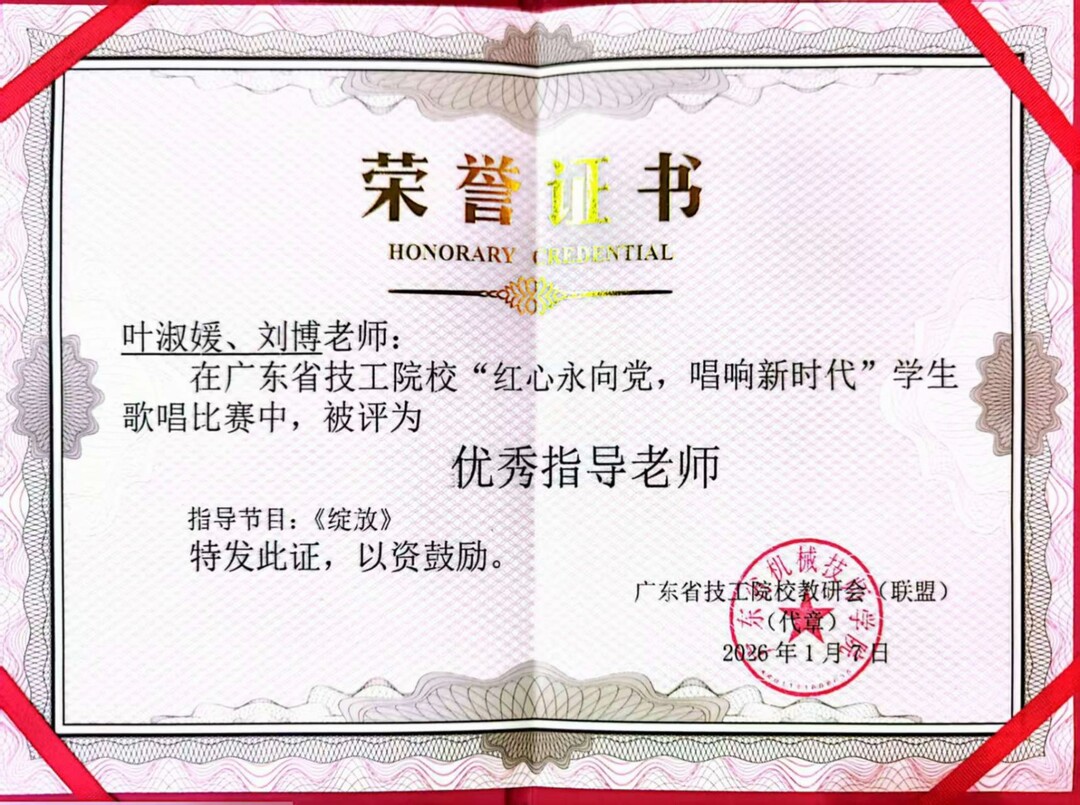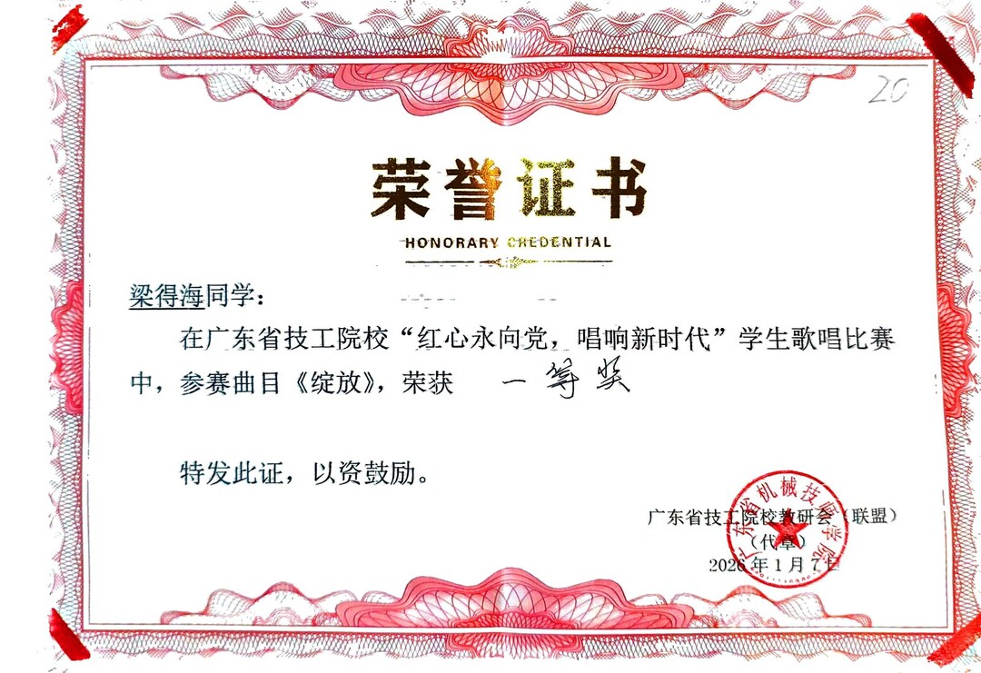 2026年1月7日晚,“红心永向党·唱响新时代”广东省技工院校学生歌唱比赛决赛圆满落幕。我院机电一体化专业3年制高2401班梁得海同学凭借扎实的演唱功底与真挚的情感表达,以一曲《绽放》惊艳全场,从众多参赛选手中脱颖而出,一举夺魁,摘得大赛一等奖,为学院赢得荣誉。