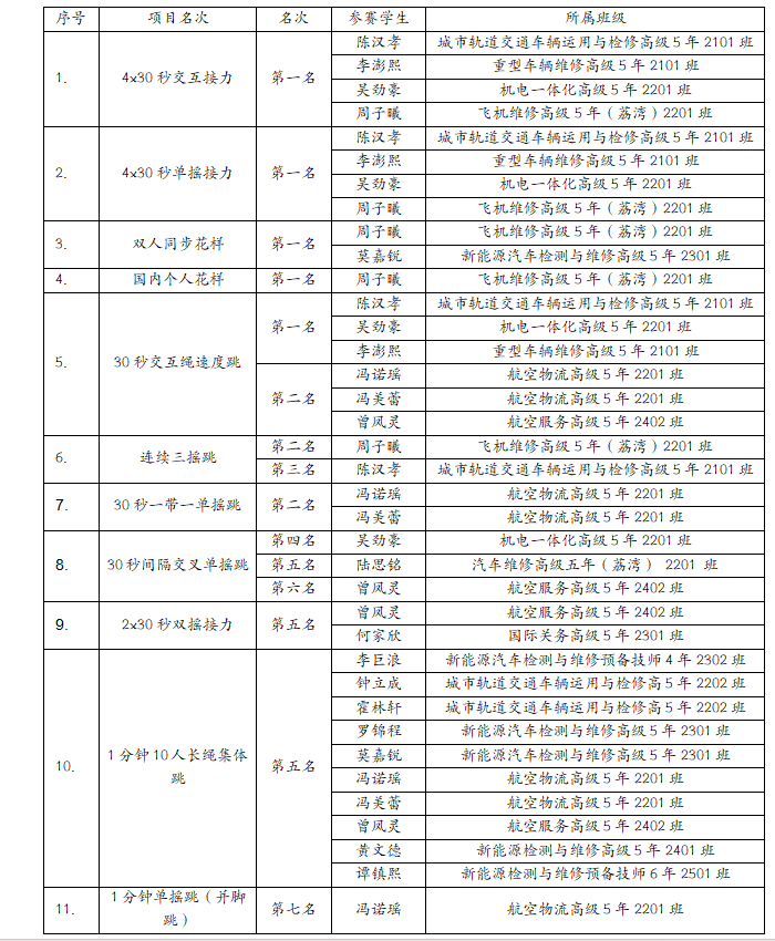 此外,队员们在其他项目中同样表现亮眼:冯诺瑶、冯美蕾、曾凤灵组合拿下 30 秒交互绳速度跳亚军及 30 秒一带一单摇跳亚军;周子曦获连续三摇跳亚军,陈汉孝获该项目季军;吴劲豪、陆思铭、曾凤灵等队员在多个单项中跻身前八,1 分钟 10 人长绳集体跳、2x30 秒双摇接力等集体项目也斩获第五名的好成绩,全面展现了我院学子的综合竞技实力。