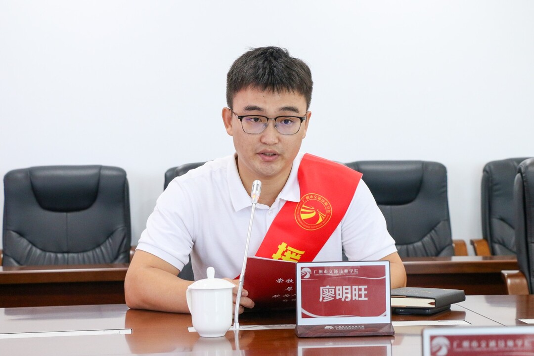 在座谈会上,廖明旺老师发表了临别感言。他说,“本人成长于广州市交通技师学院,十分感激母校多年来对本人的支持与培养。这次援疆支教任务,既是一份责任也是学院给予我的又一次成长机会,我一定会坚守‘躬行成事,修身立德’的校训,用心用力把支教工作做好,不辜负学院对本人的期待,努力为祖国边疆教育事业的发展添砖加瓦。”