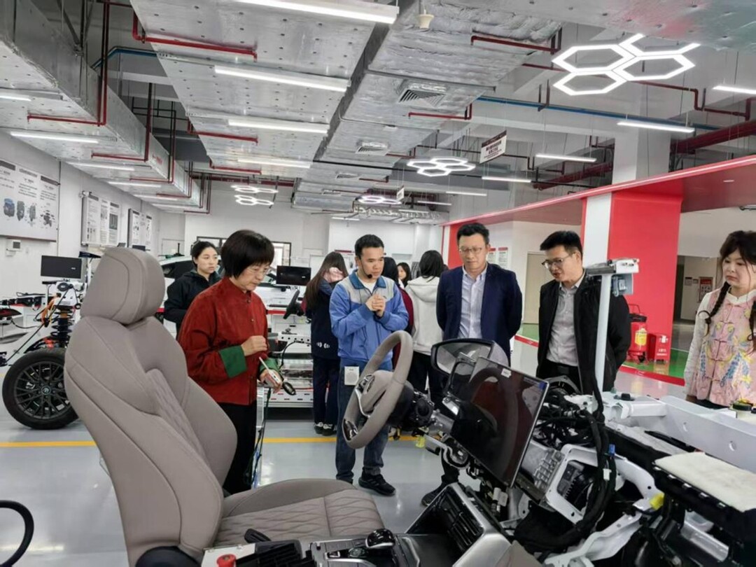 会后,来访嘉宾实地参观了长安汽车产业学院、比亚迪产业学院,先进的实训设施设备和产教融合工学一体的人才培养模式让麦文辉部长一行印象深刻。