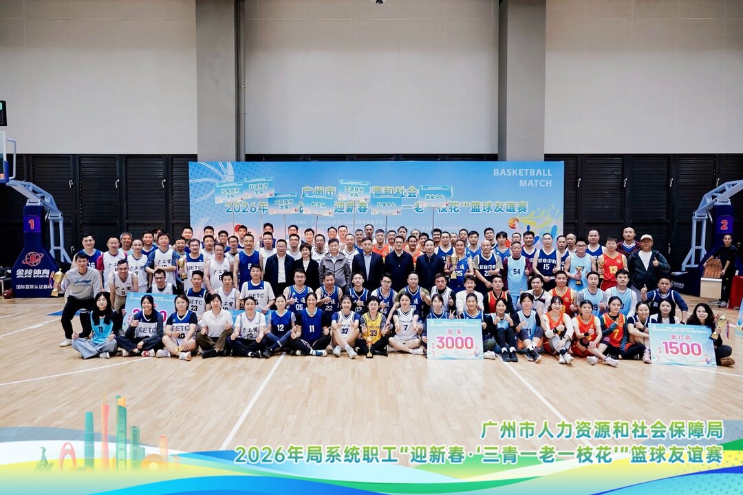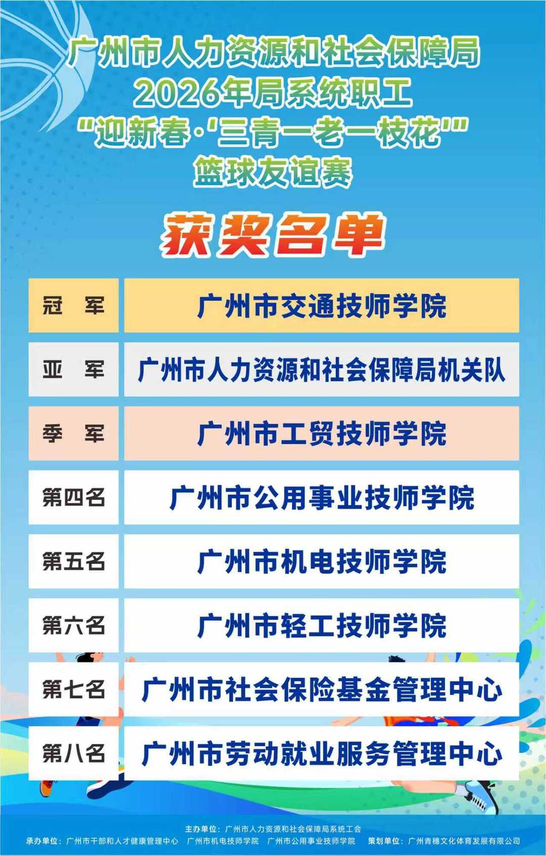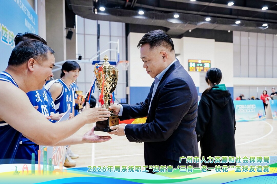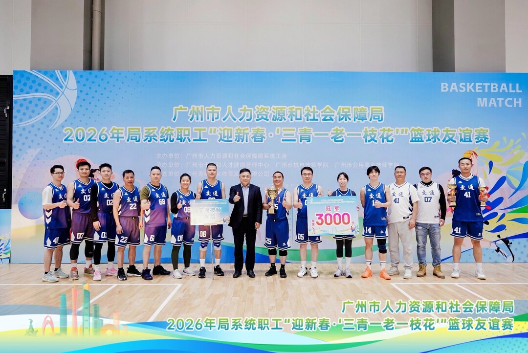 1月12日,由广州市人力资源和社会保障局系统工会主办的2026年“迎新春·‘三青一老一枝花’”篮球友谊赛在广州市第二工人文化宫完满收官。该赛事从2025年12月22日至2026年1月12日举办,共有来自局机关及局属单位的17支代表队、近200名职工运动员参赛。经过多轮激烈角逐,广州市交通技师学院代表队凭借出色的团队协作、顽强的拼搏精神和巧妙的战术安排,一路过关斩将,最终荣获赛事冠军,其中教职工于念以突出表现获得赛事“最佳MVP”,为学院2026年文体赛事新征程赢得“开门红”。
