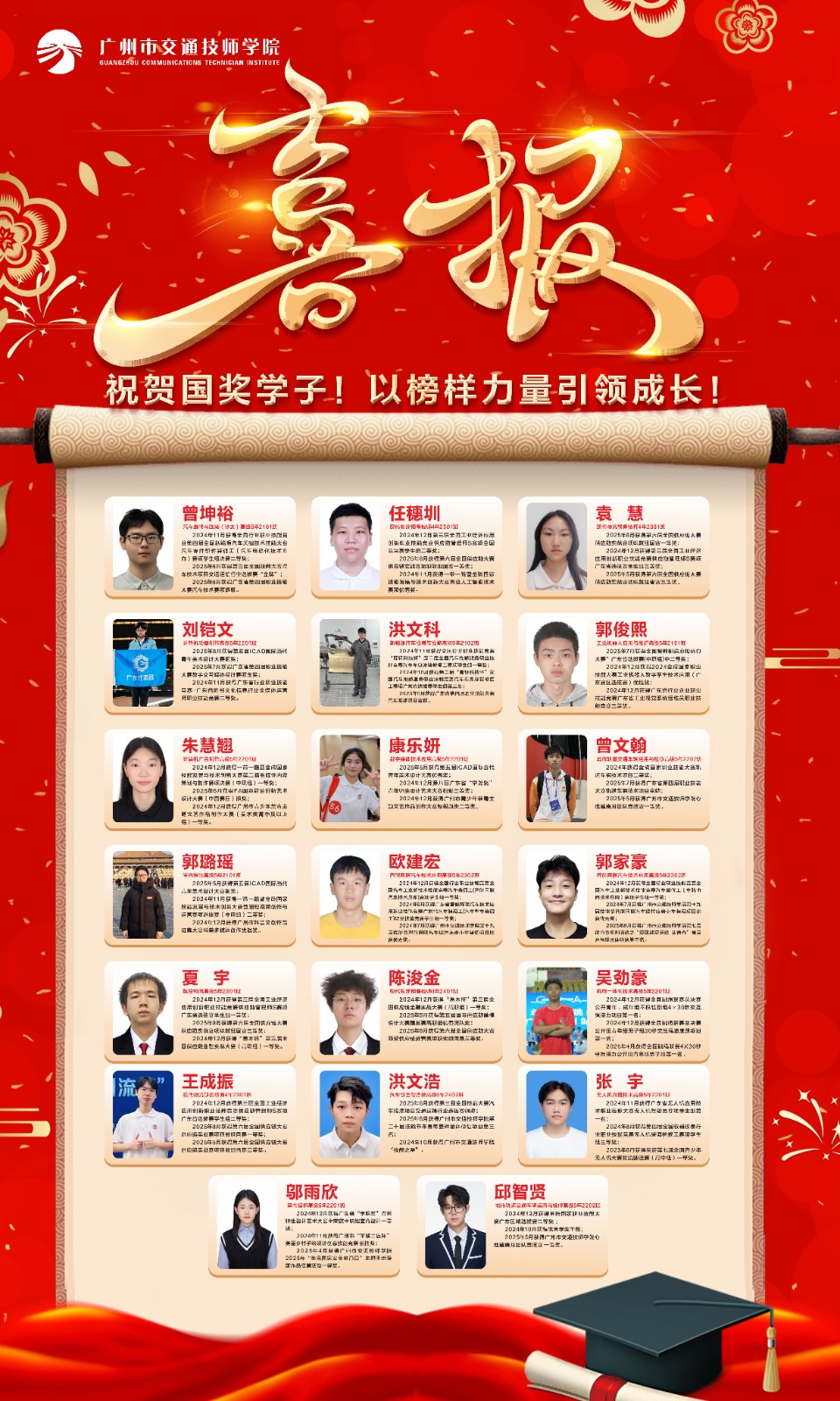 近日,根据《教育部人力资源社会保障部关于2024—2025学年度中等职业教育国家奖学金获奖学生名单的公告》,广州市交通技师学院20名优秀学凭借扎实的专业技能、优异的学习成绩和全面的综合素质,历经多轮选拔脱颖而出,成功获此殊荣,充分展现了新时代技工院校学子德技并修、奋发向上的良好风貌。