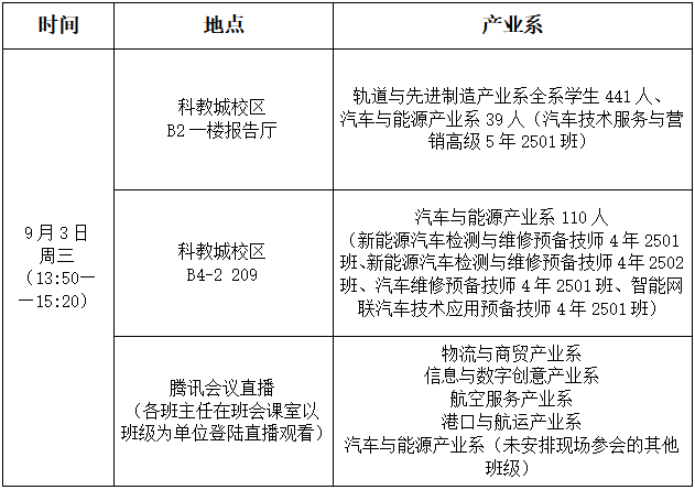 (2)在课室收看讲座直播的班级,请班主任组织体检完的学生回到课室收看讲座直播;讲座结束后,将签到表(纸质)、活动照片提交至各产业系,并于9月5日前交至创新创业指导中心黄琪老师处。