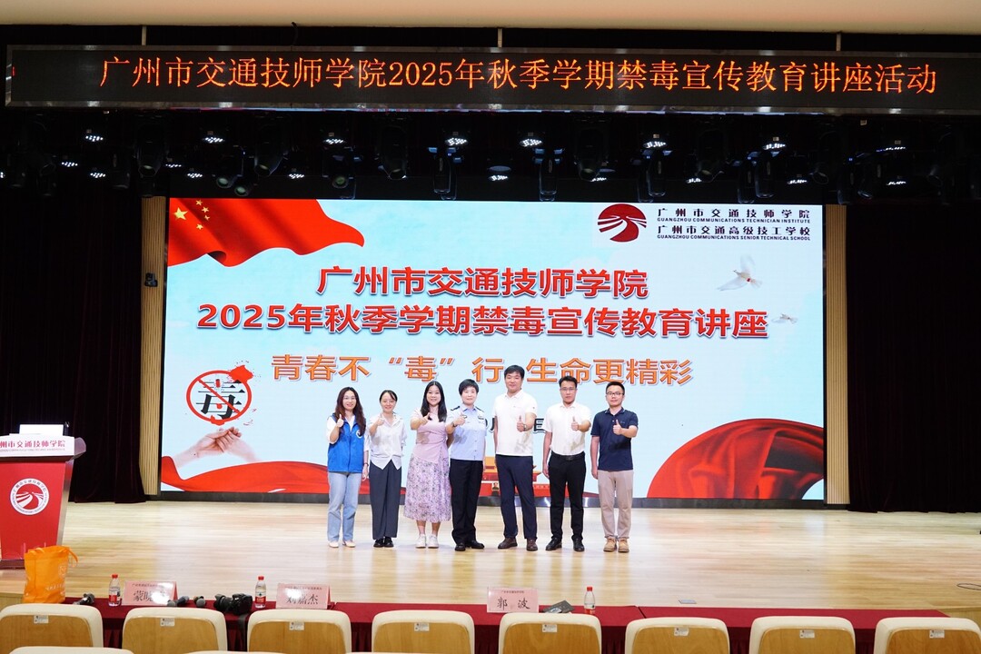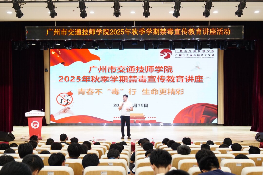2025年9月16日下午,广州市交通技师学院在科教城校区B2报告厅举办了2025年秋季学期禁毒宣传教育讲座。学生工作处副主任郭波、刘胜坤老师以及各产业系近8000名学生通过线上线下方式参与了此次讲座。讲座由学生工作处许锐埼老师主持。