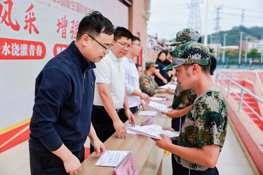 在总结表彰环节,梁登院长与刘海波副院长分别宣读了表彰决定。院领导及各产业系领导为在军训中表现突出的个人与集体颁发荣誉证书与奖状。这份沉甸甸的荣誉,既是对过往七日拼搏的见证,更是对集体精神的最好诠释。荣光加身,亦是使命在肩,经过淬炼的新生必将以此为序章,在未来的求学路上续写更加辉煌的篇章。